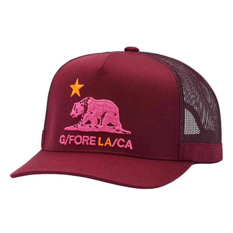 This trucker features a built-in sweatband with a breathable interlock knit and mesh body, perfect for hot days on the green. With an adjustable snapback closure, you'll have the best fit for all day play. Features the California flag & text in satin stitch embroidery. Shop G/Fore and more at Worldwide Golf Shops