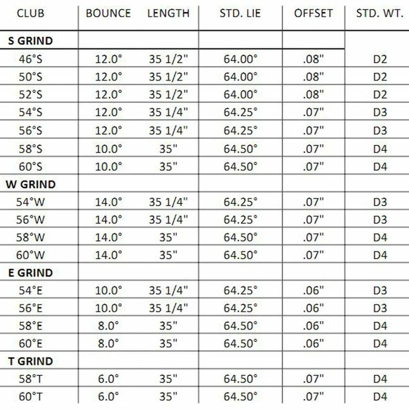 | Loft/Bounce | 50° Loft – 12° Bounce, 52° Loft – 12° Bounce, 54° Loft – 10° Bounce, 54° Loft – 12° Bounce, 54° Loft – 14° Bounce, 56° Loft – 10° Bounce, 56° Loft – 12° Bounce, 56° Loft – 14° Bounce |